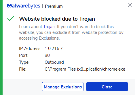 The IP address 1.0.215.7 was blocked as part of the range 1.0.215.7/32 by Malwarebytes because it was associated with a Trojan.