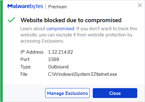 The IP address 1.32.214.82 was blocked by Malwarebytes because a server at this IP have been compromised.