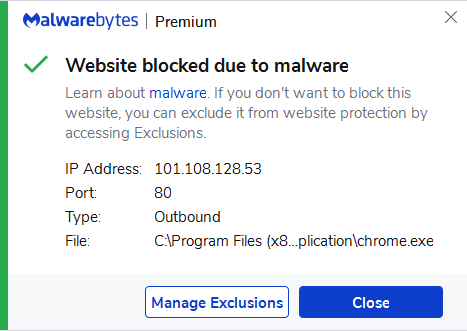 The IP address 101.108.128.53 was blocked as part of the range 101.108.128.53/32 by Malwarebytes because it was associated with a Trojan.
