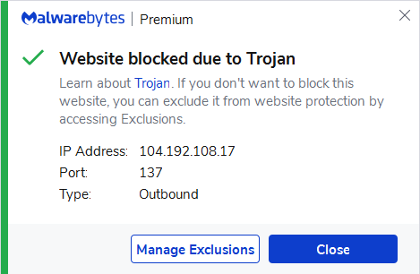 The IP 104.192.108.17 was blocked because it was associated with a Trojan.