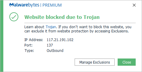 The IP 117.21.191.102 was blocked because it was associated with a Trojan detected by Malwarebytes as Trojan.Dropper.