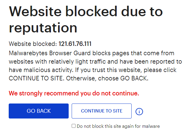 The IP address 121.61.76.111 was blocked by Malwarebytes as part of the range 121.61.76.111/32 because it was associated with riskware.
