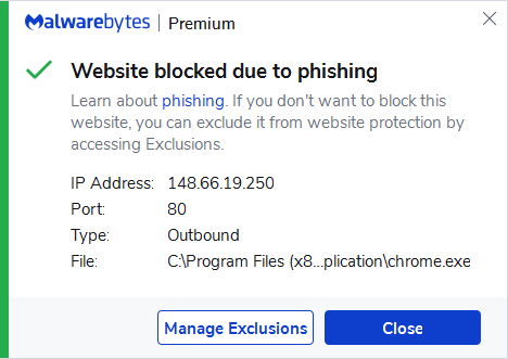 The IP address 148.66.19.250 was blocked by Malwarebytes as part of the range 148.66.19.250/32 because it is associated with phishing.