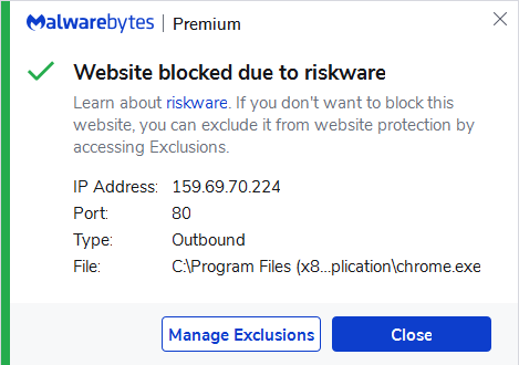 The IP address 159.69.70.224 was blocked by Malwarebytes as part of the range 159.69.70.224/32 because it was associated with riskware.
