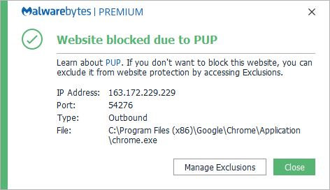 The IP 163.172.229.229 was blocked because it hosted fraudulent advertisements and PUPs.