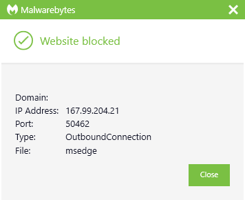 The IP address 167.99.204.21 was blocked as part of the range 167.99.204.21/32 by Malwarebytes because it was associated with a Trojan.