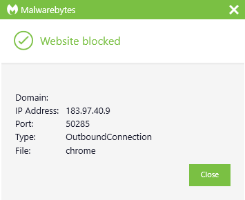 The IP address 183.97.40.9 was blocked as part of the range 183.97.40.9/32 by Malwarebytes because it was associated with a Trojan.