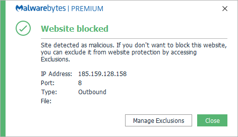 The IP 185.159.128.158 because it is involved with a trojan detected by Malwarebytes as Trojan.TrickBot.