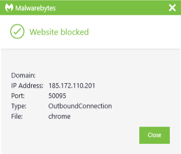 The IP address 185.172.110.201 was blocked as part of the range 185.172.110.201/32 by Malwarebytes because it was associated with a Trojan.