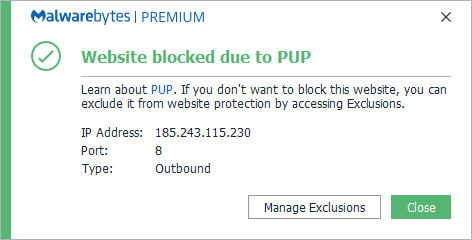 The IP address 185.243.115.230 was blocked because it was involved with a potentially unwanted program (PUP).