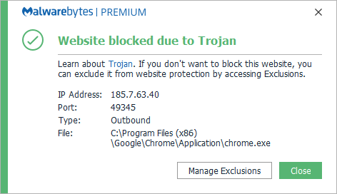 The IP address 185.7.63.40 was blocked because it was associated with a Trojan.