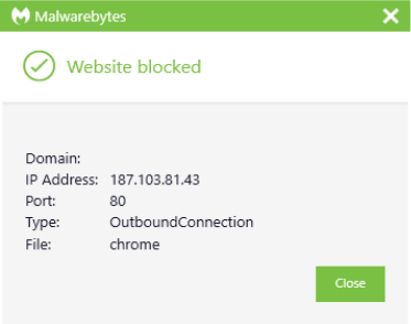 The IP address 187.103.81.43 was blocked as part of the range 187.103.81.43/32 by Malwarebytes because it was associated with a Trojan.