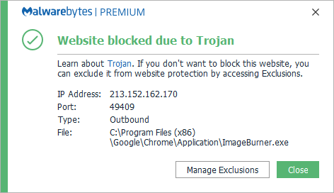 The IP address 213.152.162.170 was blocked because it was associated with a Trojan.