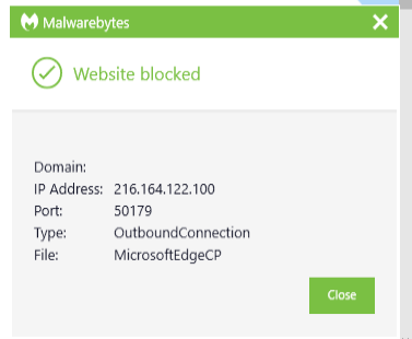 The IP address 216.164.122.100 was blocked as part of the range 216.164.122.100/32 by Malwarebytes because it was associated with a Trojan.