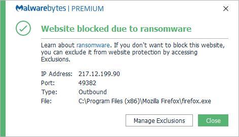 The IP 217.12.199.90 was blocked because it was associated with Ransomware detected by Malwarebytes as Ransom.Locky.