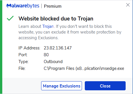 The IP address 23.82.136.147 was blocked as part of the range 23.82.136.147/32 by Malwarebytes because it was associated with a Trojan.