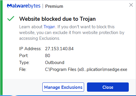 The IP address 27.153.140.84 was blocked as part of the range 27.153.140.84/32 by Malwarebytes because it was associated with a Trojan.