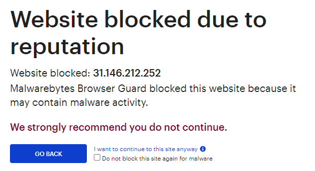 The IP address 31.146.212.252 was blocked as part of the range 31.146.212.252/32 by Malwarebytes because it was associated with a Trojan.