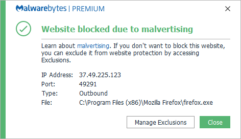 The IP 37.49.225.123 was blocked because it was associated with a potentially unwanted program (PUP) detected by Malwarebytes as PUP.Optional.InstallCore.