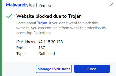 The IP address 42.115.20.173 was blocked because it was associated with a Trojan.