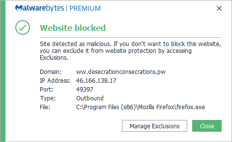 The IP 46.166.138.17 is detected by Malwarebytes because it redirects visitors to sites with potentially unwanted programs (PUPs).