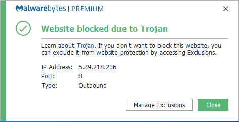 The IP address 5.39.218.206 was blocked because it was associated with a Trojan.