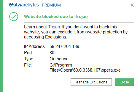 The IP address 58.247.204.139 was blocked because it was associated with a Trojan.