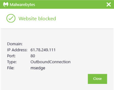 The IP address 61.78.249.111 was blocked as part of the range 61.78.249.111/32 by Malwarebytes because it was associated with a Trojan.