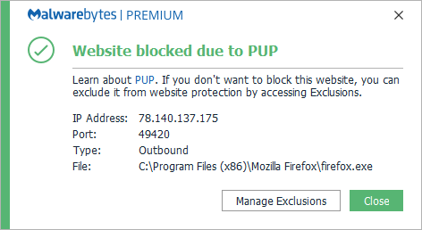 The IP address 78.140.137.175 was blocked because it was associated with potentially unwanted programs (PUPs).
