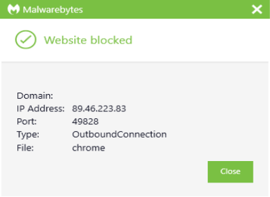 The IP address 89.46.223.83 was blocked as part of the range 89.46.223.83/32 by Malwarebytes because it was associated with a Trojan.