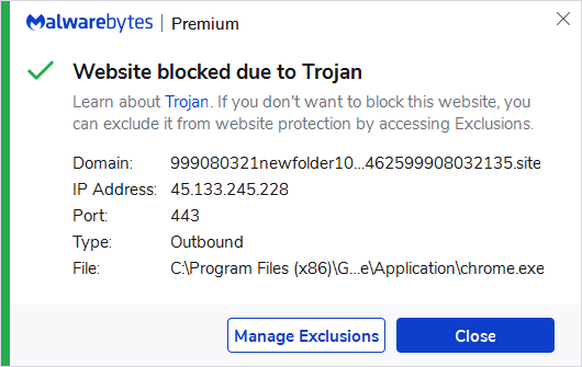 The domain 999080321newfolder1002-01462599908032135.site was blocked by Malwarebytes because it was associated with a Trojan.