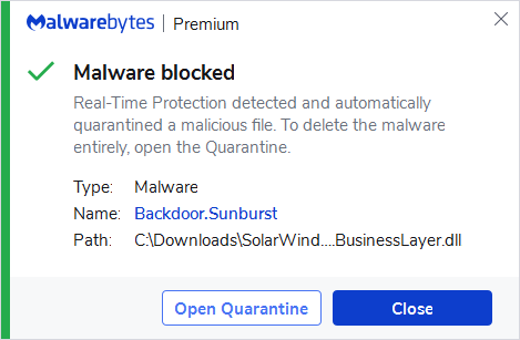 Backdoor.Sunburst is Malwarebytes’ detection name for a trojanized update to SolarWind’s Orion IT monitoring and management software.