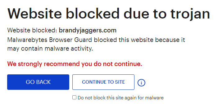 The domain brandyjaggers.com was blocked by Malwarebytes because it was associated with a Trojan detected as Trojan.SmokeLoader.