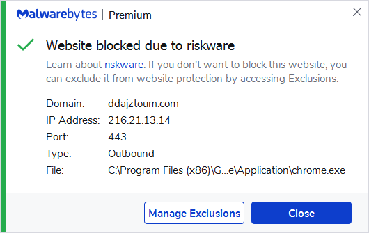 The domain ddajztoum.com was blocked by Malwarebytes because it was associated with riskware.