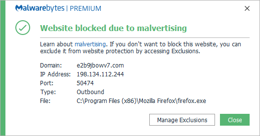 The domain e2b9jbowv7.com was blocked because it was associated with malvertising.