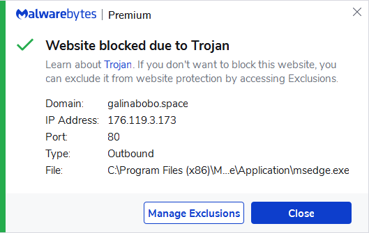 The domain galinabobo.space was blocked by Malwarebytes because it was associated with a Trojan.