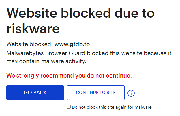 Malwarebytes blocks the domain gtdb.to because it was associated with riskware.