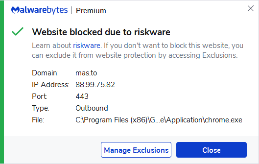 Malwarebytes Premium and Browser Guard block the domain mas.to because it was associated with riskware.