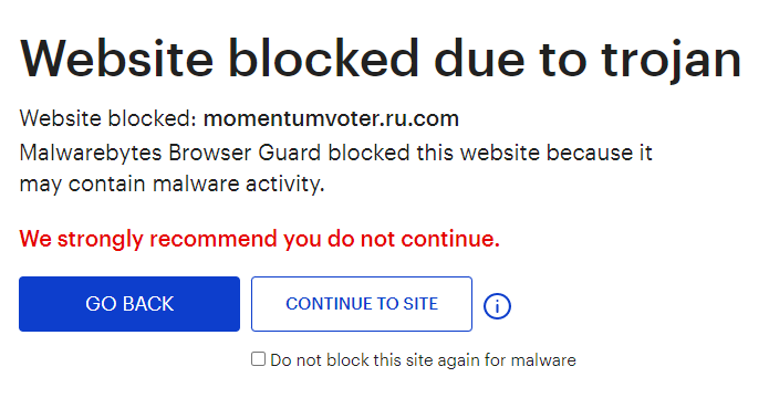 The domain momentumvoter.ru.com was blocked by Malwarebytes because it was associated with a Trojan.
