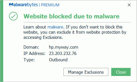 The subdomains hp.myway.com and dll.myway.com are blocked because they are related to potentially unwanted programs (PUPs) detected by Malwarebytes as PUP.Optional.Mindspark.