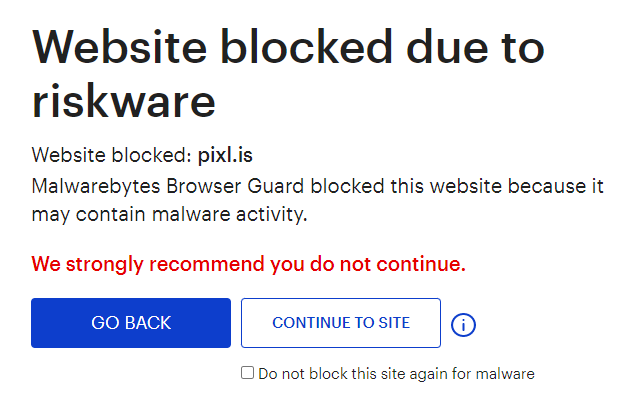 Malwarebytes Premium and Browser Guard block the domain pixl.is because it was associated with riskware.
