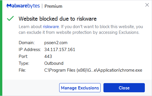The domain psoen2.com was blocked by Malwarebytes because it was associated with riskware.