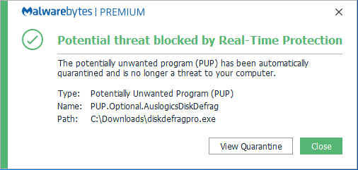 Malwarebytes can detect and remove PUP.Optional.AuslogicsDiskDefrag without further user interaction.