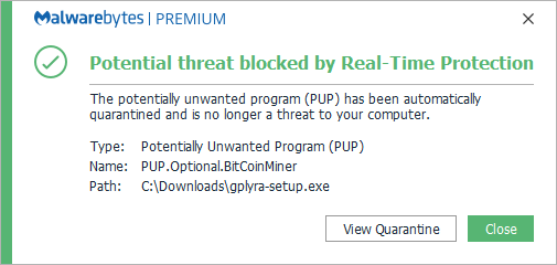 PUP.Optional.BitCoinMiner is Malwarebytes’ generic detection name for programs that use system resources to earn payments in digital currencies. Since it is difficult to determine if they are installed by the system user or by a threat actorwho receives the payments, Malwarebytes alerts you about their presence.