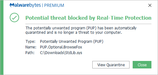 Malwarebytes can detect and remove PUP.Optional.BrowseFox without further user interaction.