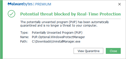Malwarebytes can detect and remove PUP.Optional.WindowsProtectManager without further user interaction.