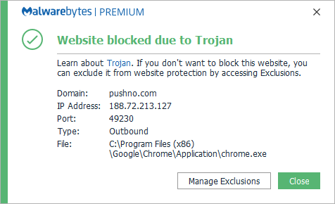 The domain pushno.com was blocked by Malwarebytes because it is associated with a Trojan detected by Malwarebytes as Trojan.BitCoinMiner.