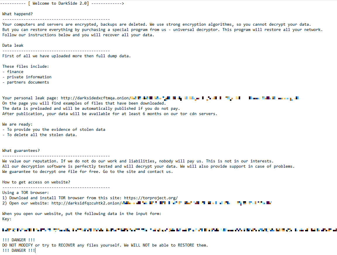 Like many other ransomware operators DarkSide has also increased pressure on its victims by threatening to publicize exfiltrated data on the dark web.