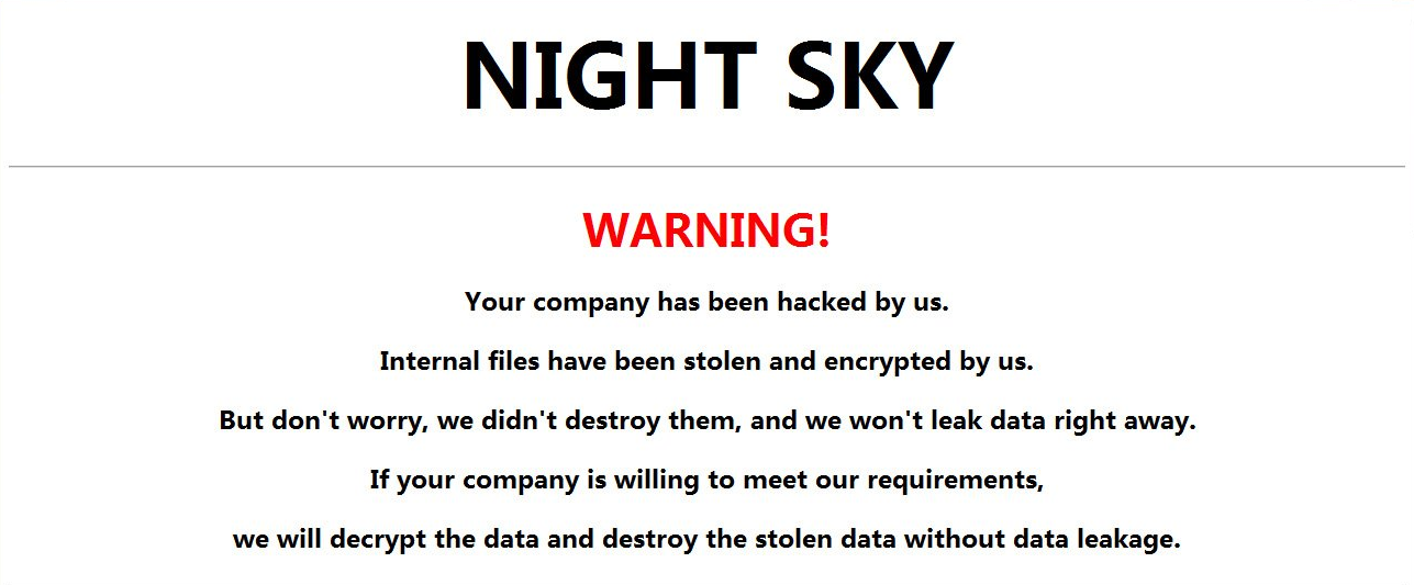 Like many other ransomware operators Night Sky has also increased pressure on its victims by threatening to publicize exfiltrated data on the dark web.