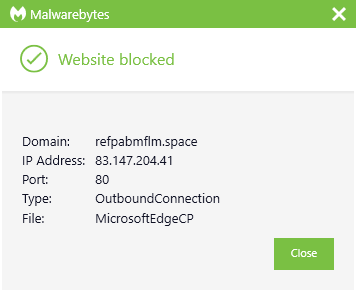The domain refpabmflm.space was blocked by Malwarebytes because it was associated with riskware.